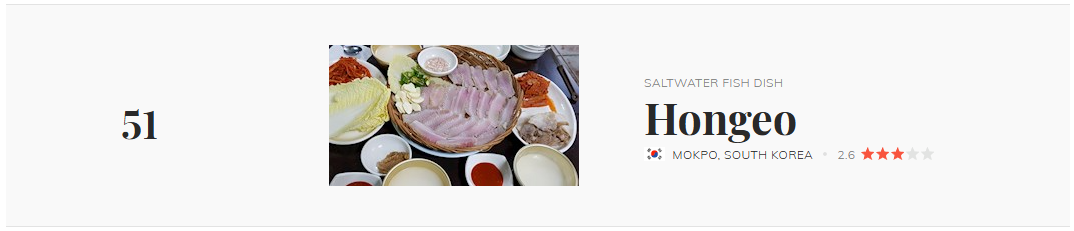 홍어는 발효 과정에서 발생하는 강한 암모니아 냄새 때문에 공중화장실을 떠올리게 한다는 혹평을 받았다. 테이스트 아틀라스는 “식사 후에도 냄새가 오래 남지만, 쫄깃한 식감과 독특한 풍미 때문에 한국에서는 별미로 사랑받는다”고 소개하며, 삼겹살과 김치를 곁들여 먹는 삼합 문화와 소주·막걸리와의 궁합도 언급했다. 국내 누리꾼들은 “외국인에게는 충분히 어려울 수 있다”면서도, 한국인의 입맛과 문화적 배경을 고려하지 않은 평가라는 지적도 나왔다.