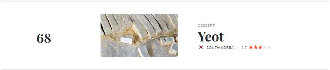 홍어 외에도 엿, 콩나물밥, 두부전이 최악 음식 100선에 포함돼 국내 독자들에게 다소 의외로 받아들여졌다. 엿은 찹쌀, 고구마, 옥수수 등으로 만든 한국 전통 과자로, 고체는 간식으로, 액체는 요리 재료로 사용된다. 콩나물밥은 다진 고기, 김치, 마늘, 참기름 등을 넣어 밥의 풍미를 살리고, 전통적으로 간장 기반 소스와 함께 먹는다. 두부전은 두부와 채소를 반죽해 기름에 노릇하게 부친 음식으로, 모두 평소 한국 가정식이나 간식으로 친숙한 요리들이다. 다만 테이스트 아틀라스는 담백한 메뉴가 하위권에 오른 이유에 대해서는 구체적으로 언급하지 않았다.
