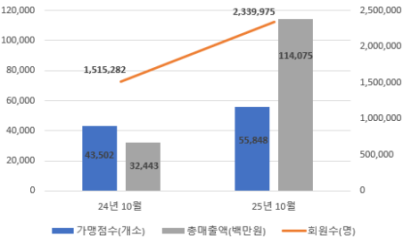 운영 지표 역시 상승세를 보였다. 지난달 기준 누적 회원 수는 233만 9,975명으로 전년 동기 대비 54.4% 늘었고, 가맹점 수는 5만 5,848개소로 28.4% 증가했다. 누적 매출액은 1,140억 7천만 원으로 약 3.5배 증가했고, 누적 주문 건수도 460만 건을 넘어 약 3.1배 늘었다.