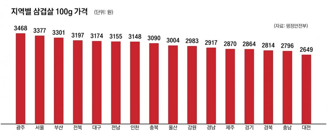 지난달 11월 기준, 삼겹살 100g 평균 가격은 광주에서 3468원으로 17개 광역지자체 중 가장 높았다. 그 뒤를 서울(3377원), 부산(3301원)이 이었으며 전북·대구·전남·인천·충북·울산 등도 3000원대를 넘어 높은 가격대를 형성했다. 삼겹살 가격 상위권이 대부분 대도시와 서남권 지역에 몰린 점도 눈에 띈다.