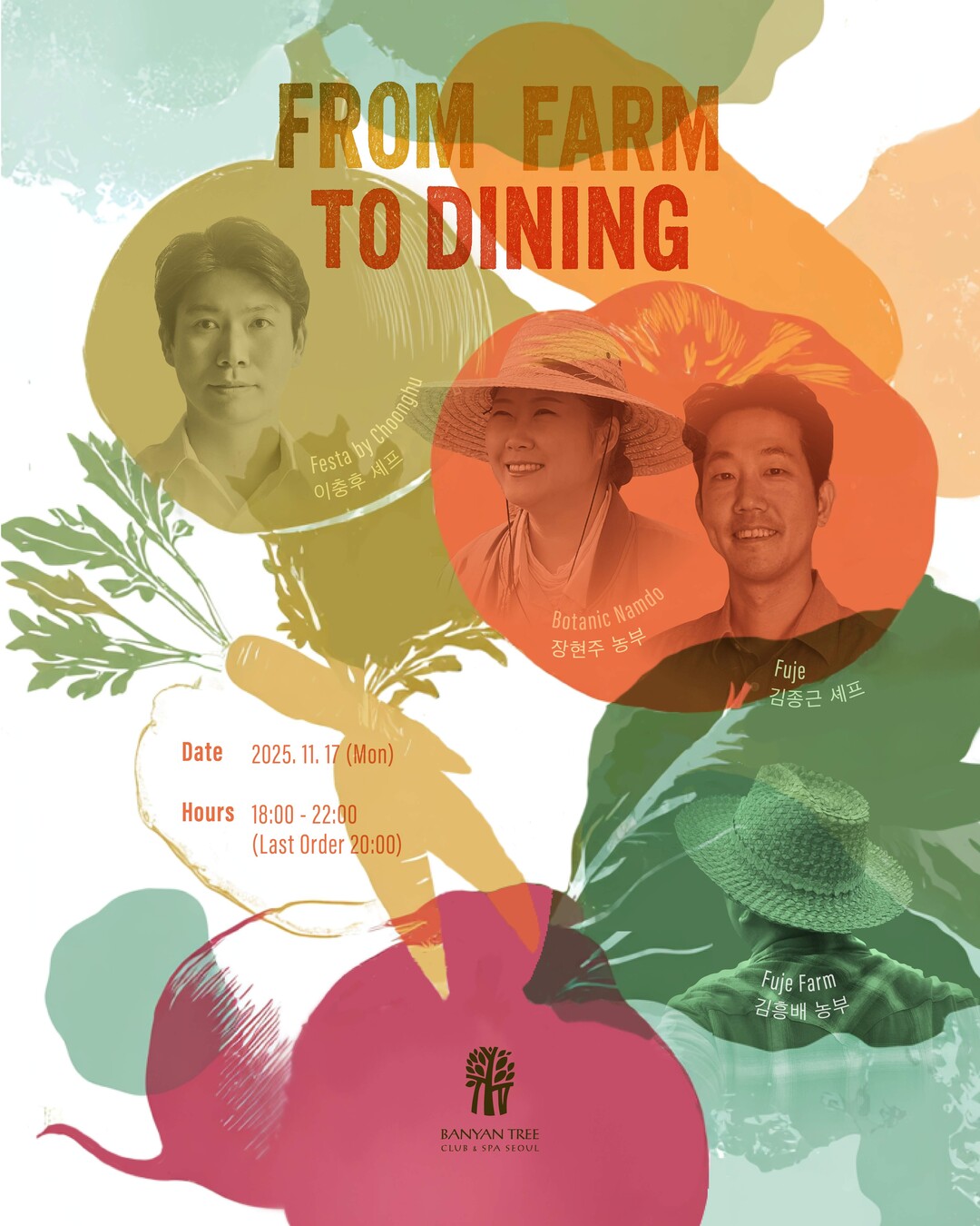 반얀트리 서울 송주용 호텔 운영 본부장은 “셰프와 농부가 함께 만들어내는 이번 협업은 지속가능한 미식 문화에 대한 새로운 관점을 제시하는 시도”라며, “단순히 배고픔을 채우는 식사가 아닌, 하나의 접시 위에 담긴 농부의 땀과 셰프의 공감이 어우러진 이야기를 맛보는 시간이 되길 바란다”고 전했다.